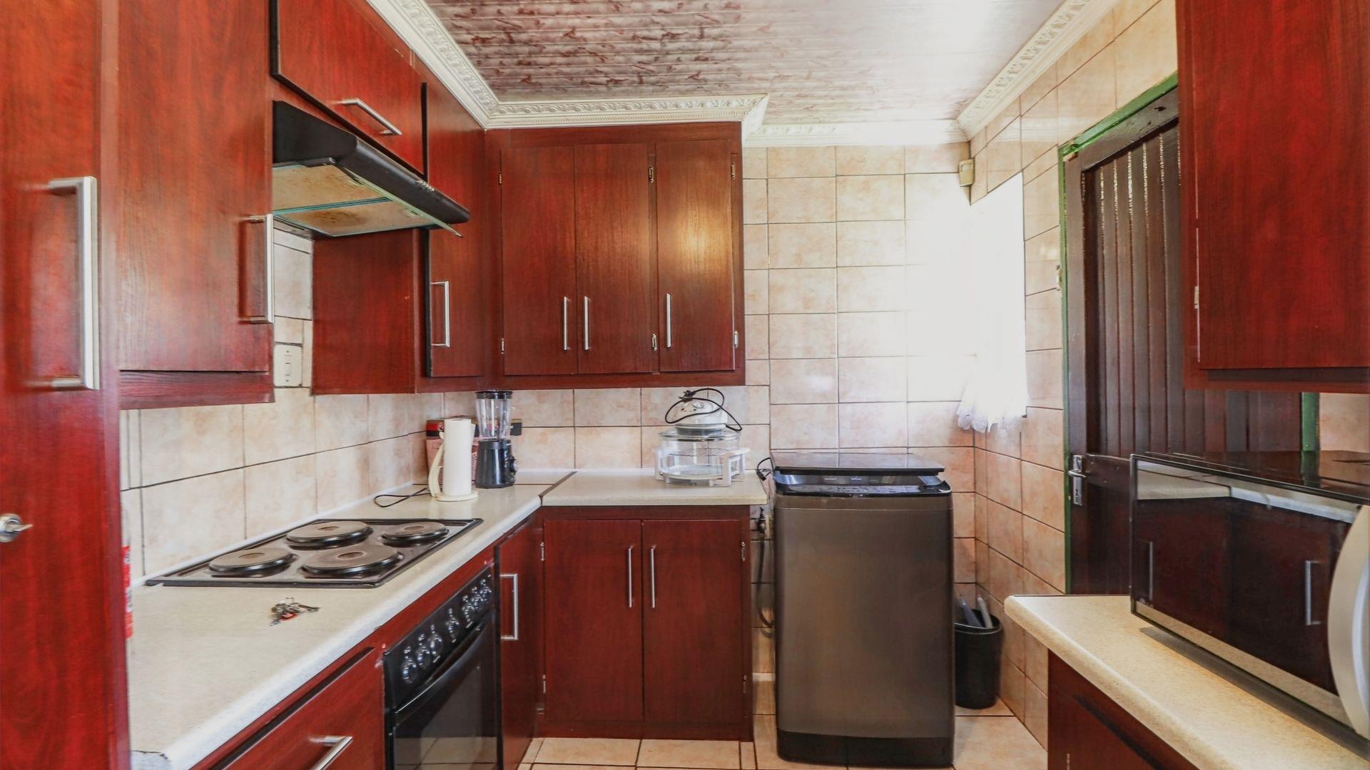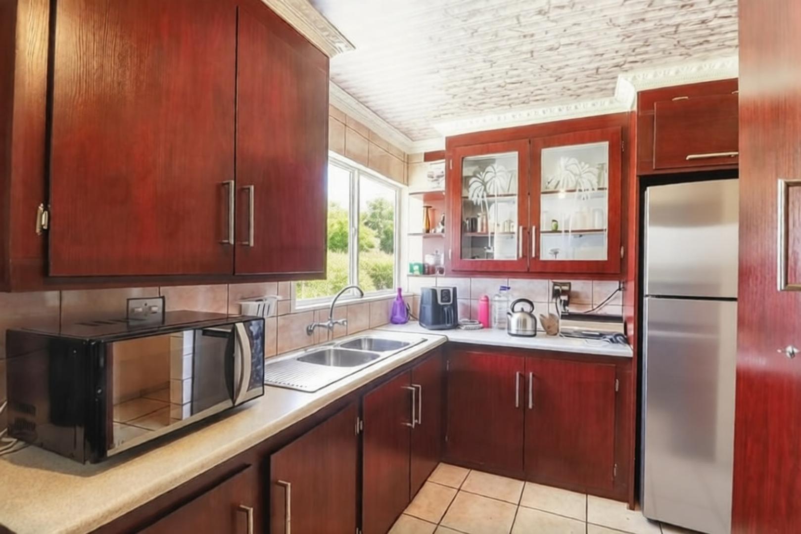 For your peace of mind, a security gate secures the passage leading to a delightful kitchen, fully equipped with built-in cupboards to accommodate all your culinary needs. The layout is both functional and stylish, making meal preparation a pleasure.