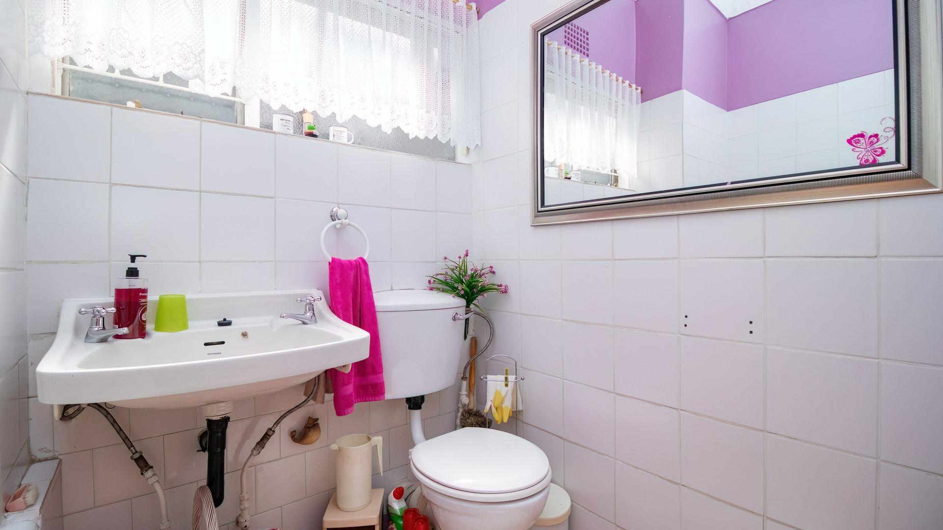 The well-appointed bathroom is designed to meet all your essential needs, featuring a bath, basin, and toilet.