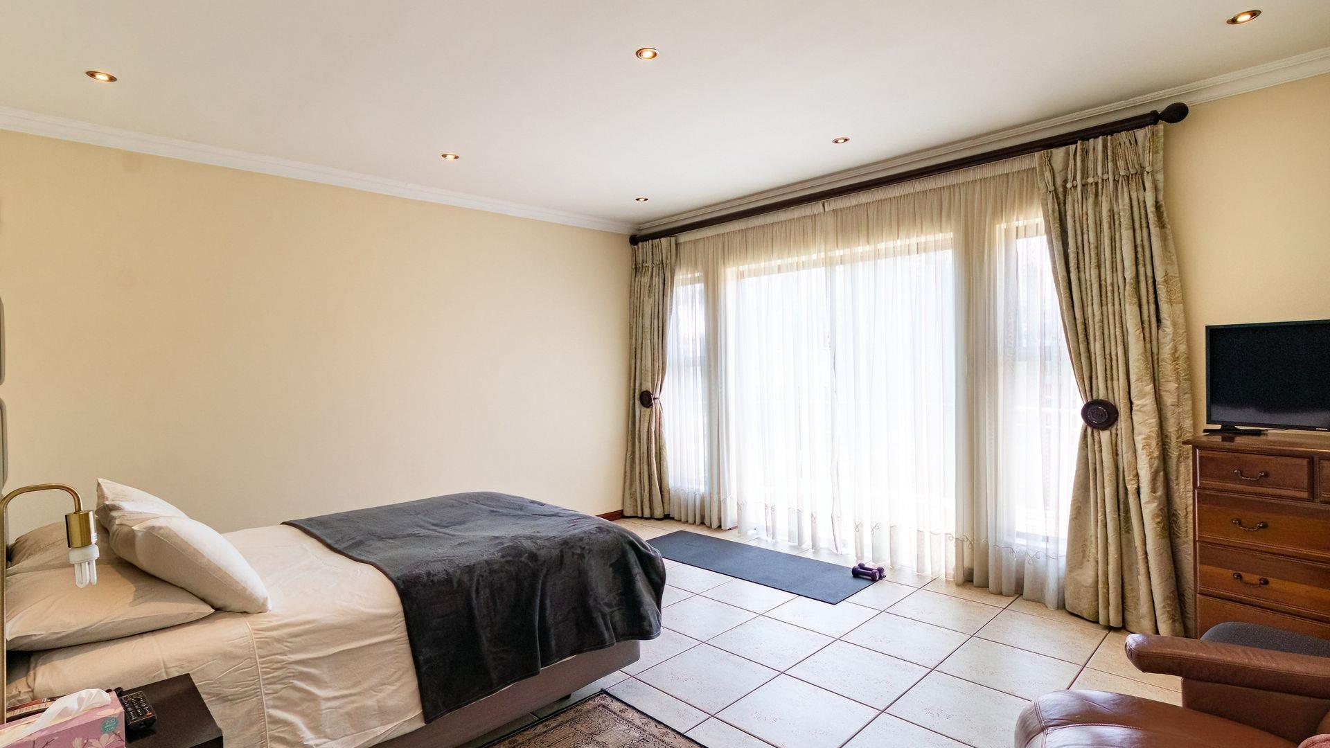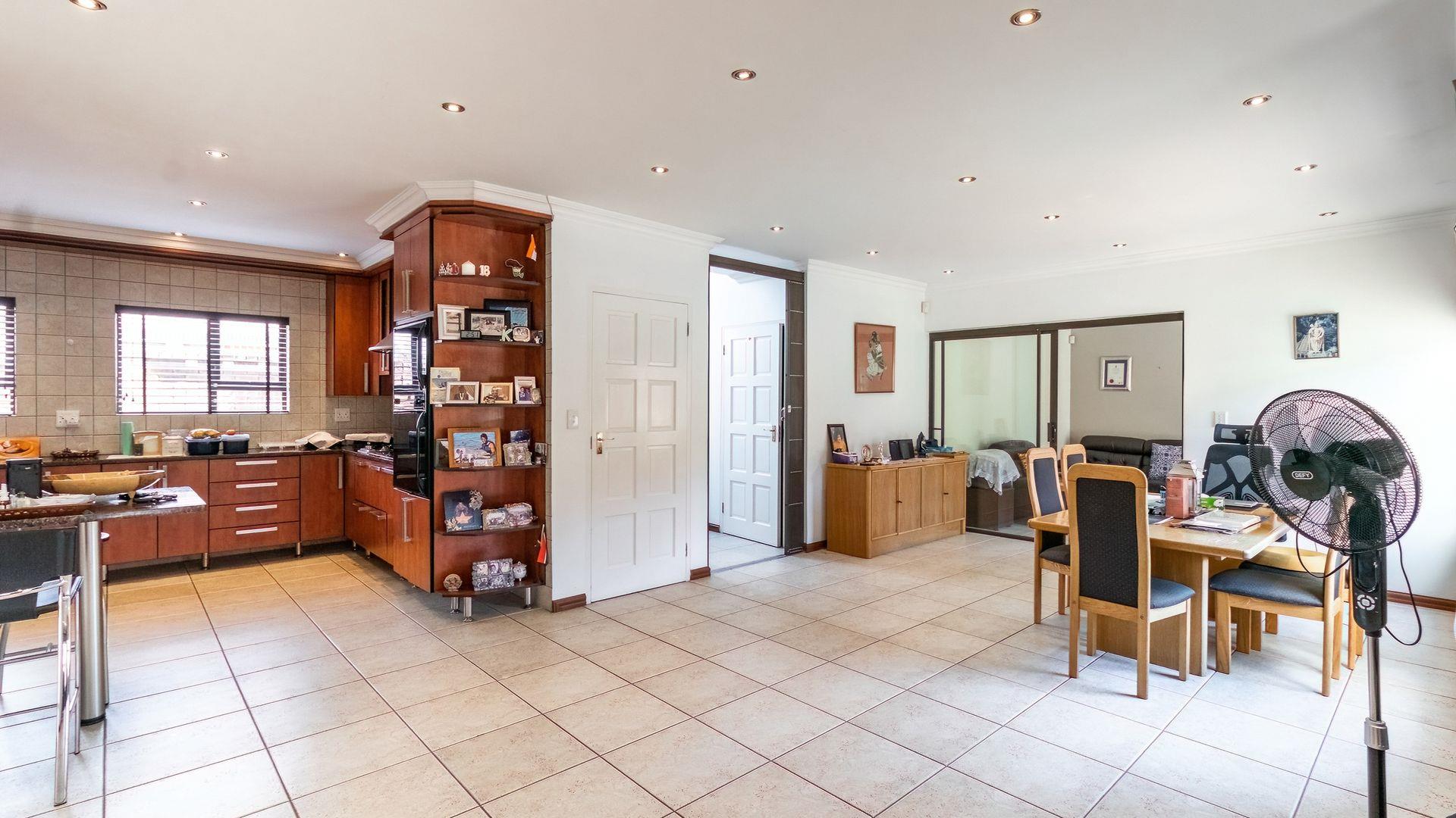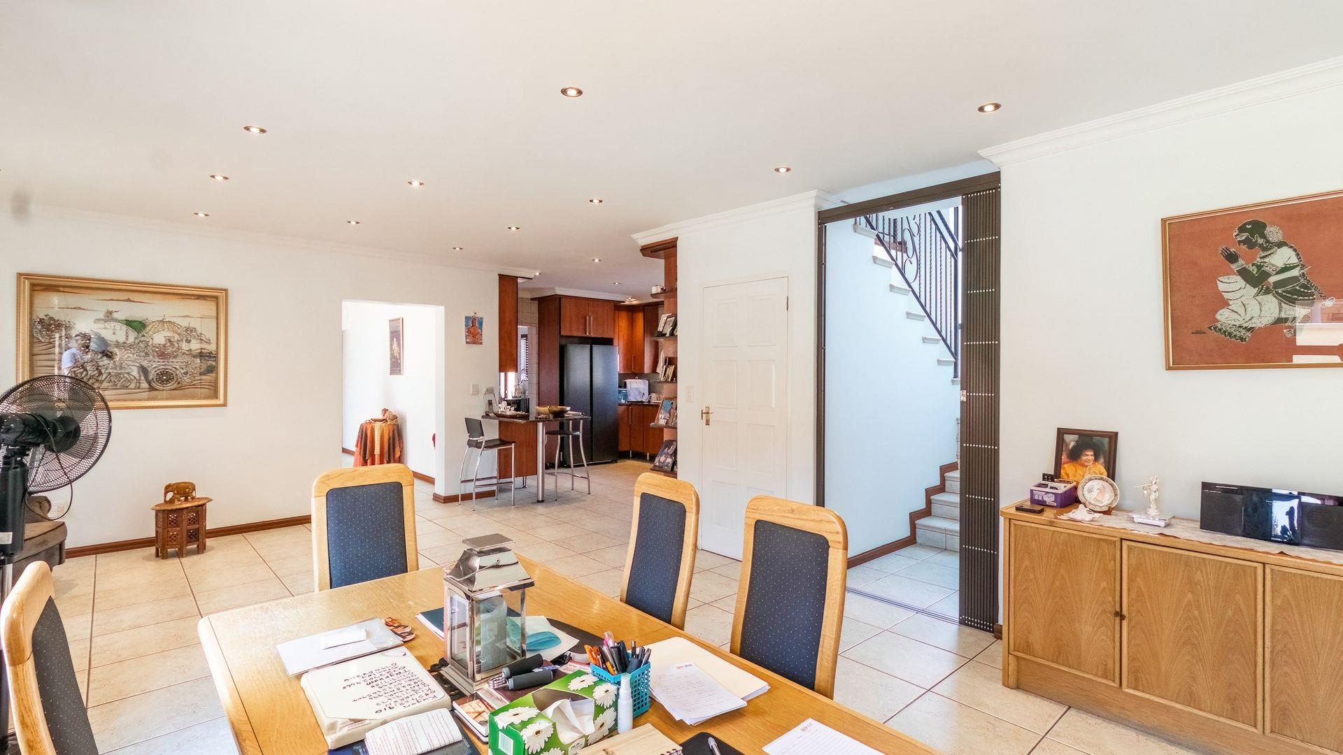 The open-plan dining and lounge area provide a spacious and inviting atmosphere, perfect for entertaining guests or enjoying quality family time. Culinary enthusiasts will be delighted by the Master Chef Kitchen, complete with a scullery, ensuring every meal preparation is a pleasure. The adjoining TV room features sliding doors that open onto a sparkling pool and beautifully manicured garden, creating an oasis of relaxation and leisure.