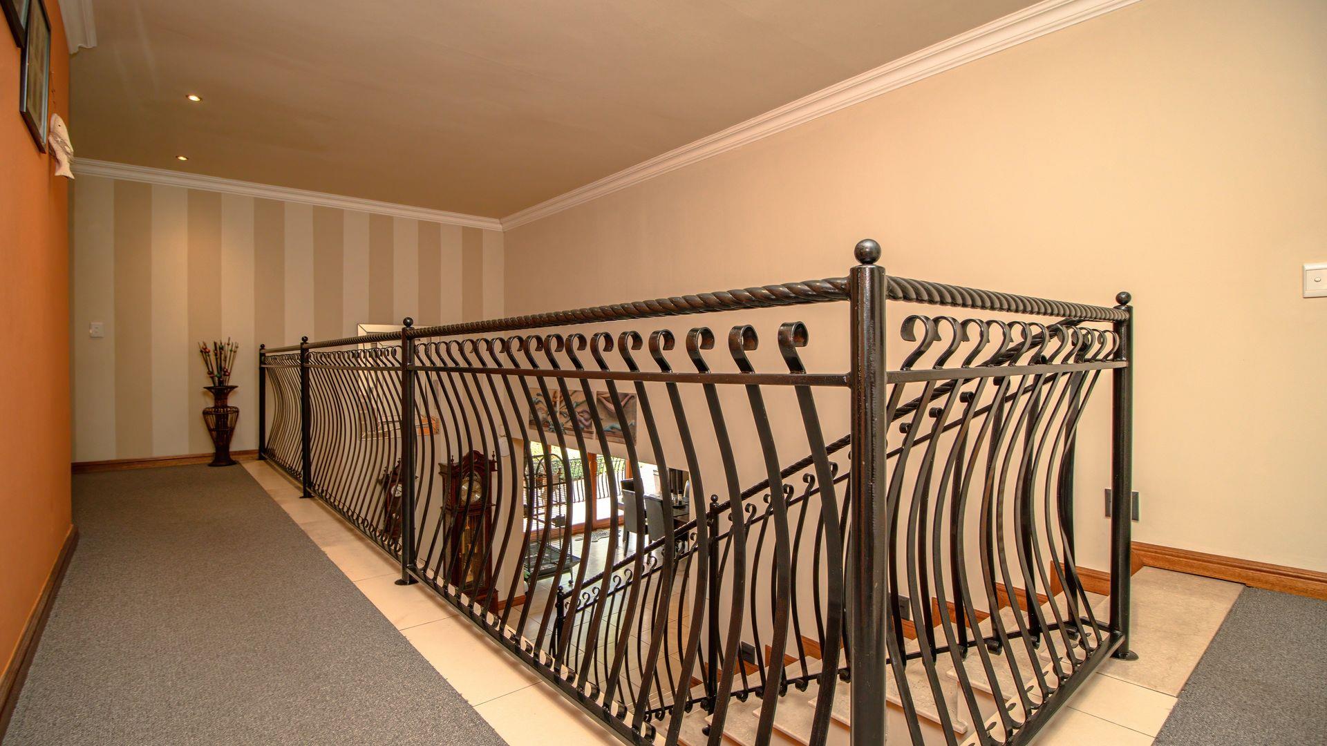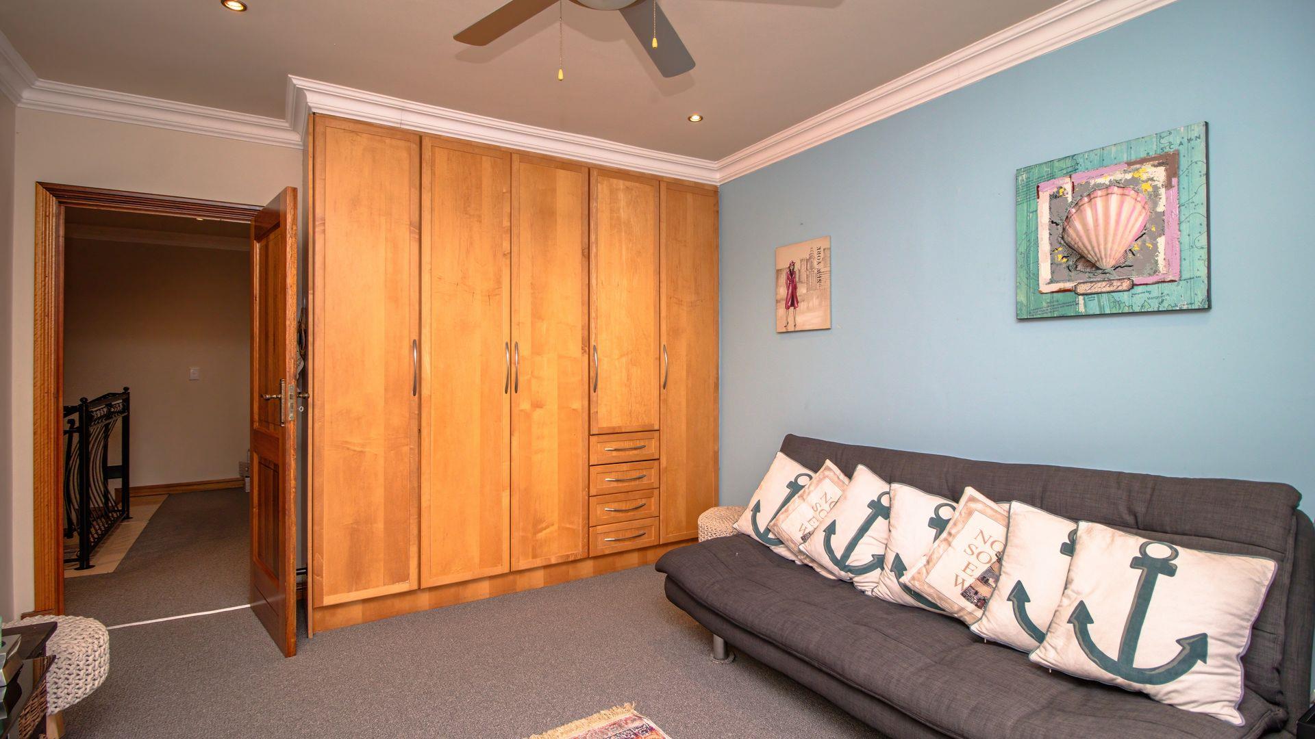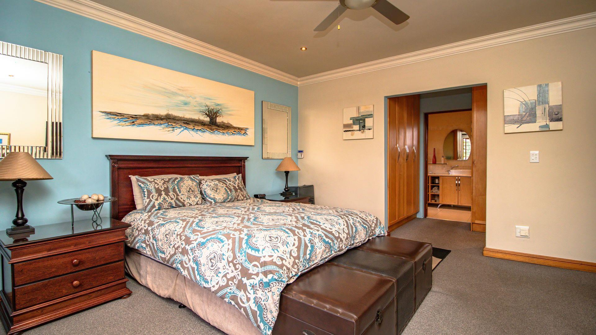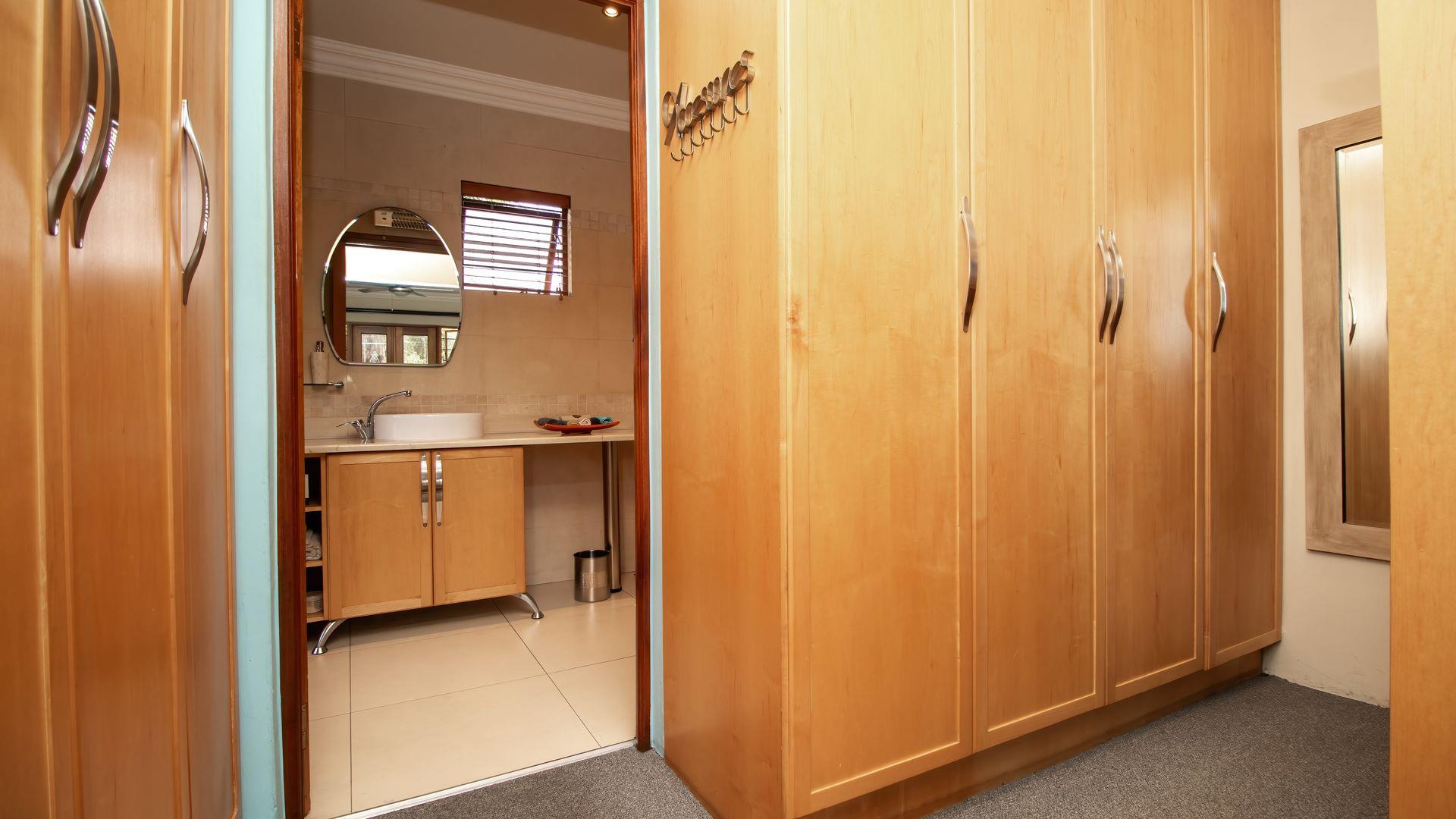 The ground floor offers a seamless blend of entertainment and living spaces. The impressive bar and entertainment room provide the perfect setting for hosting guests, while the open-plan kitchen, complete with a scullery, flows effortlessly into the dining area and lounge. The living spaces are enhanced by sliding doors that open onto a well-appointed patio, featuring a built-in braai, overlooking a sparkling pool and manicured garden—ideal for enjoying the tranquil outdoors.
