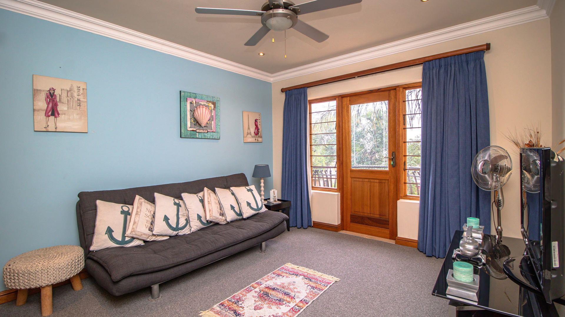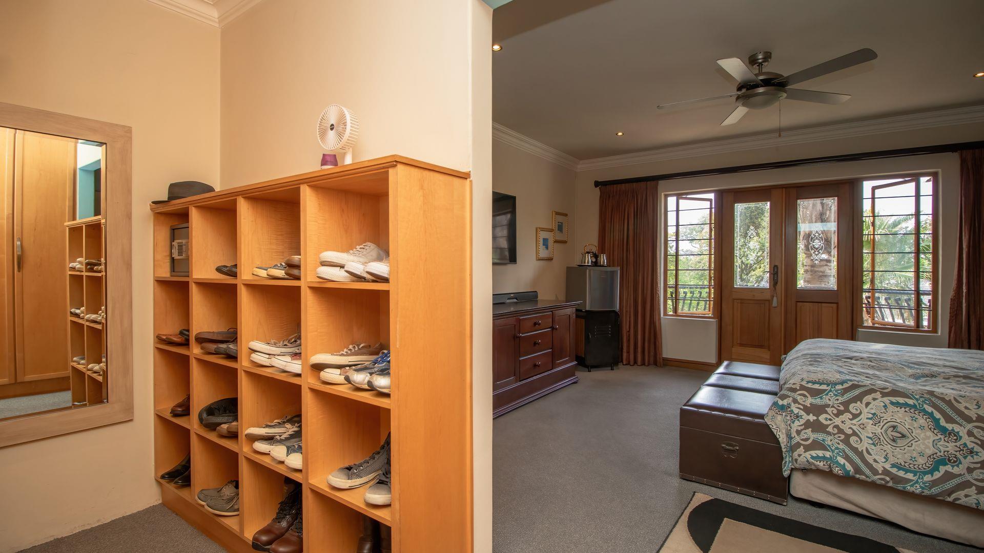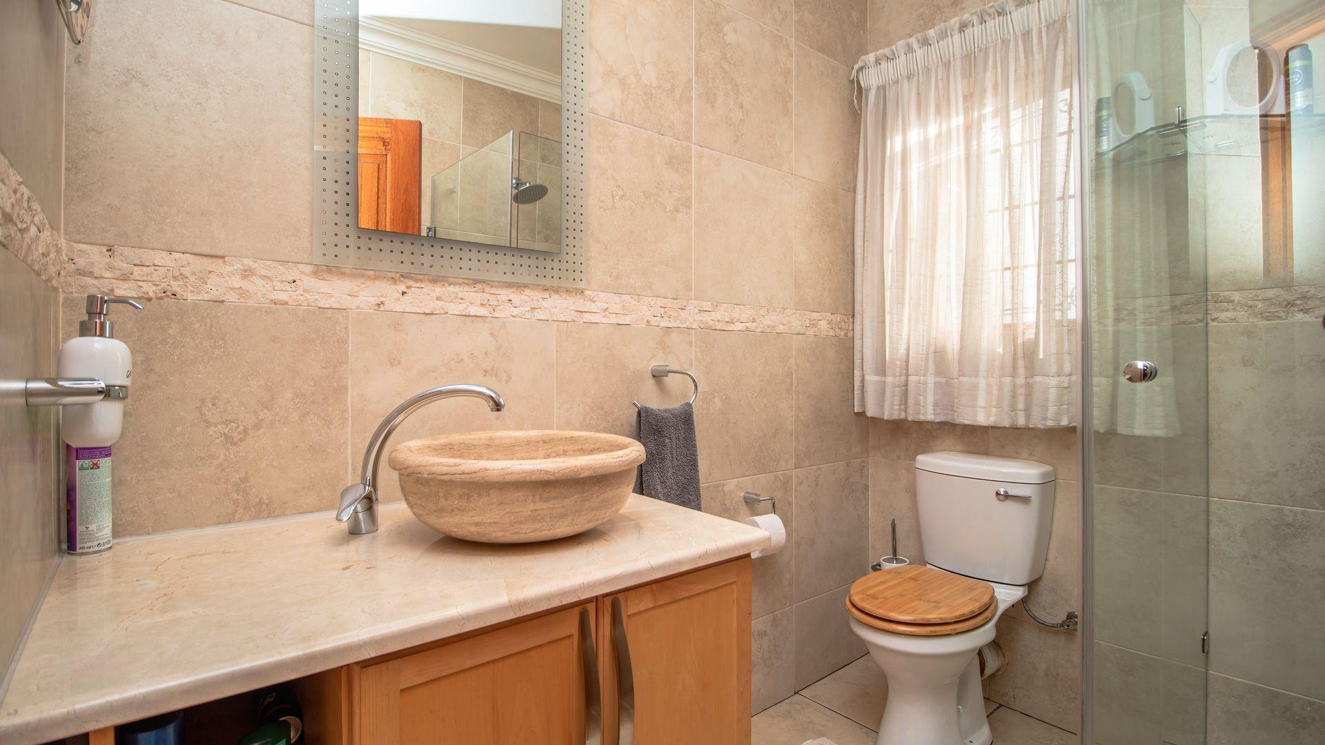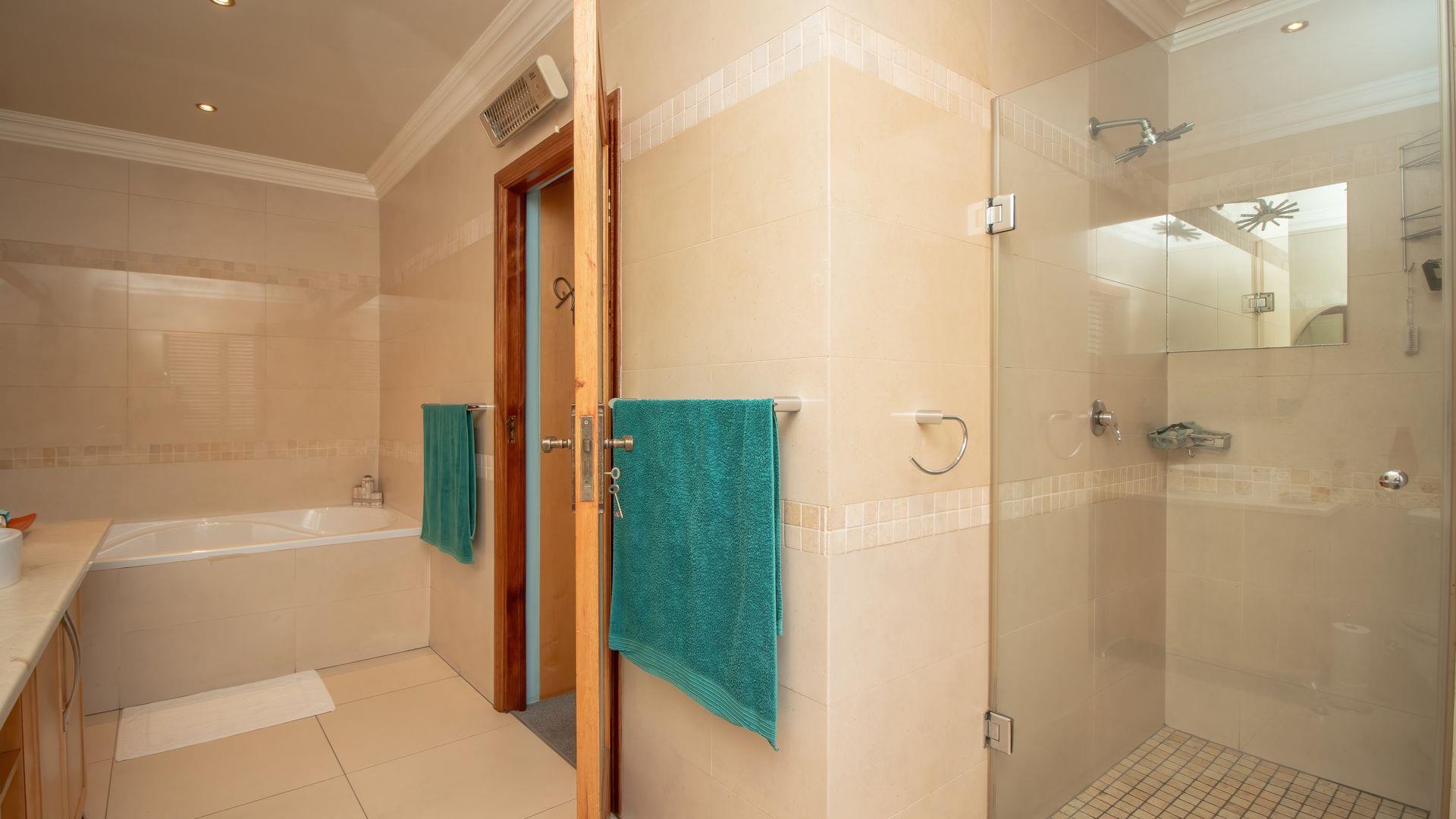 The ground floor offers a seamless blend of entertainment and living spaces. The impressive bar and entertainment room provide the perfect setting for hosting guests, while the open-plan kitchen, complete with a scullery, flows effortlessly into the dining area and lounge. The living spaces are enhanced by sliding doors that open onto a well-appointed patio, featuring a built-in braai, overlooking a sparkling pool and manicured garden—ideal for enjoying the tranquil outdoors.