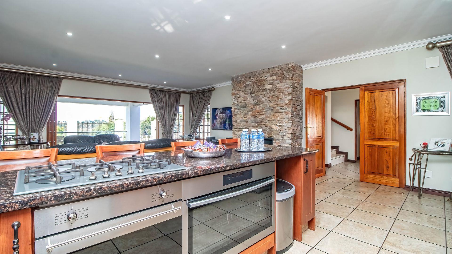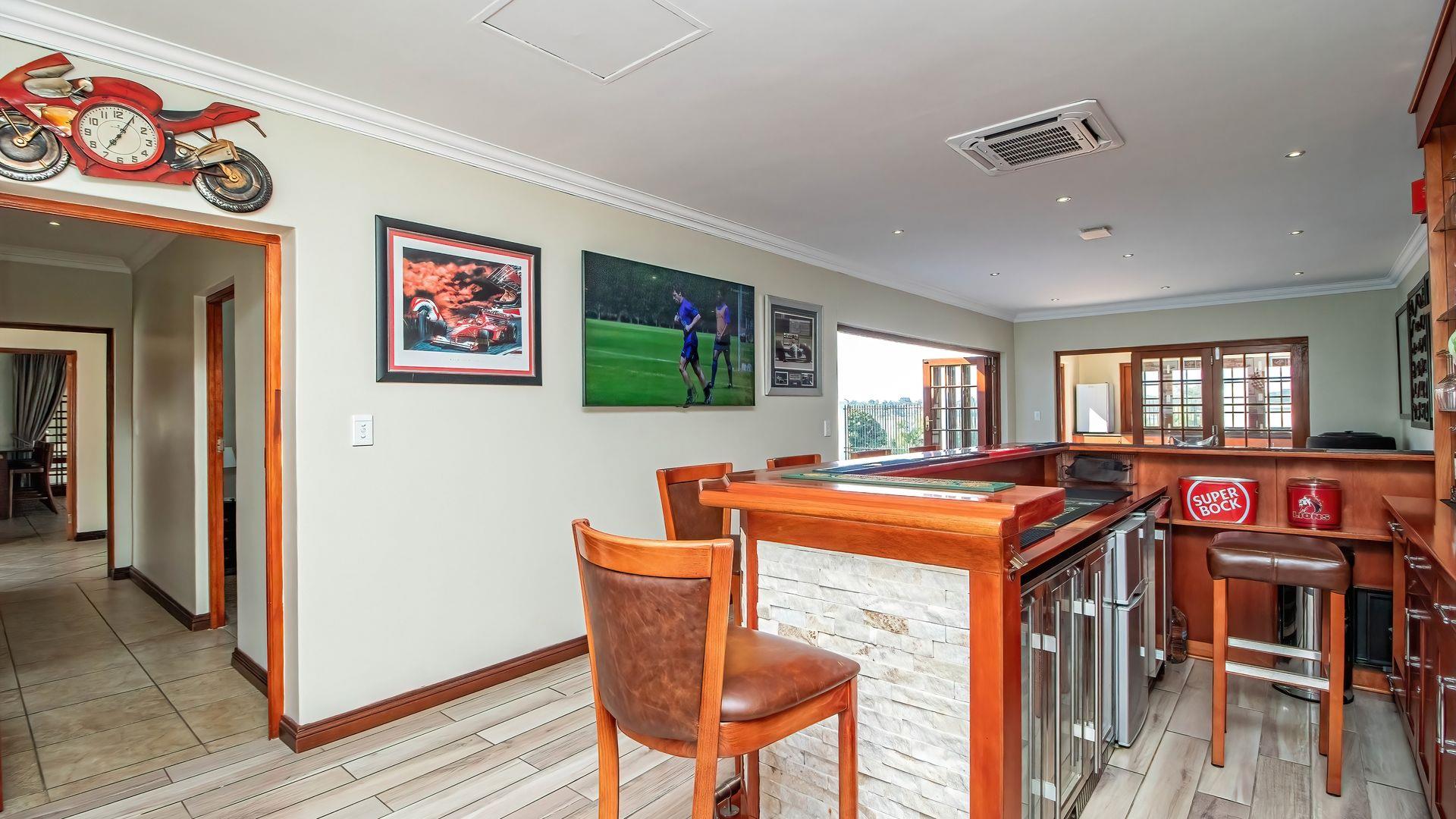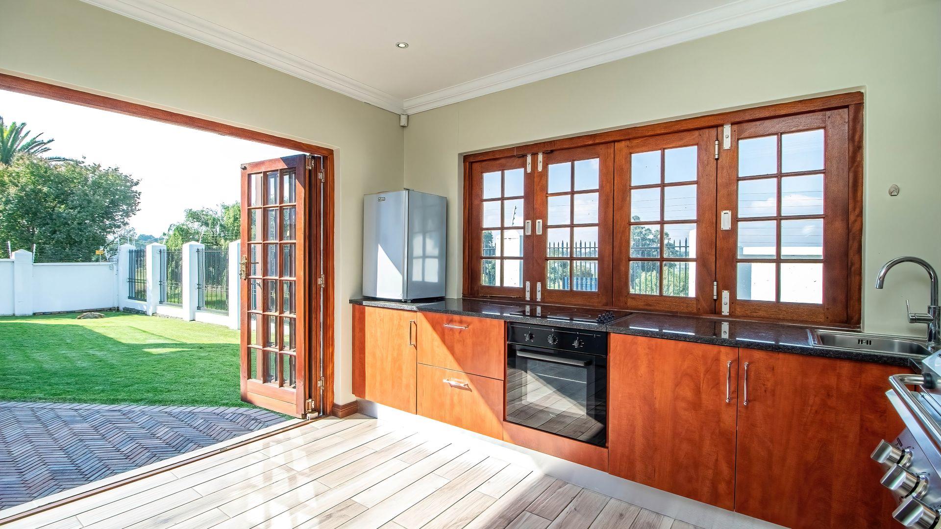 At the heart of the home lies a beautifully appointed open‐plan kitchen, complemented by a separate laundry for convenience. The kitchen flows naturally into the lounge, where a fireplace adds warmth and character. A dedicated dining room provides a formal space for family meals or entertaining, while the lounge opens onto a covered patio overlooking the landscaped garden, a tranquil setting for outdoor living. For those who enjoy entertaining, the property offers a solid‐wood bar and a purpose‐built braai room. This space is fully equipped with oven, hob, extractor fan, prep bowl, and stacker doors that extend the entertainment area seamlessly into the garden.