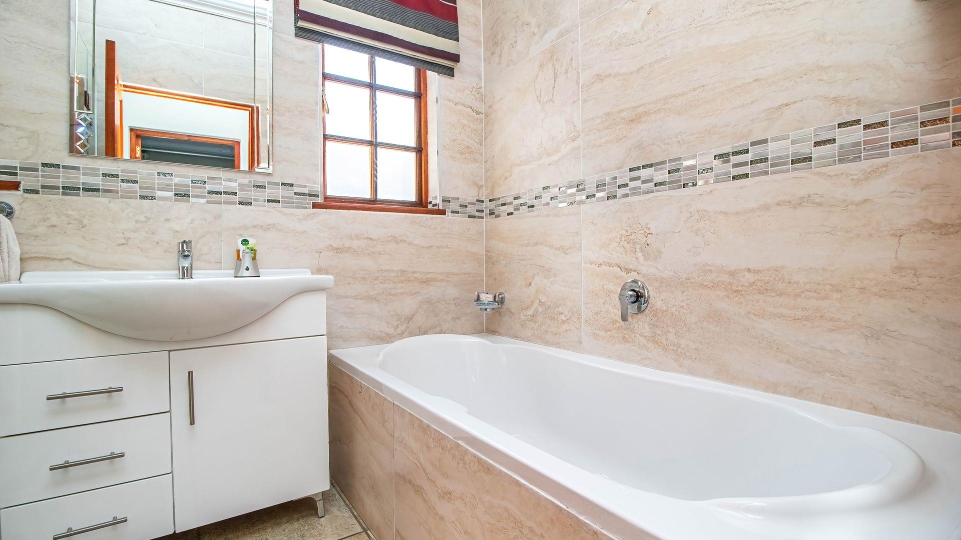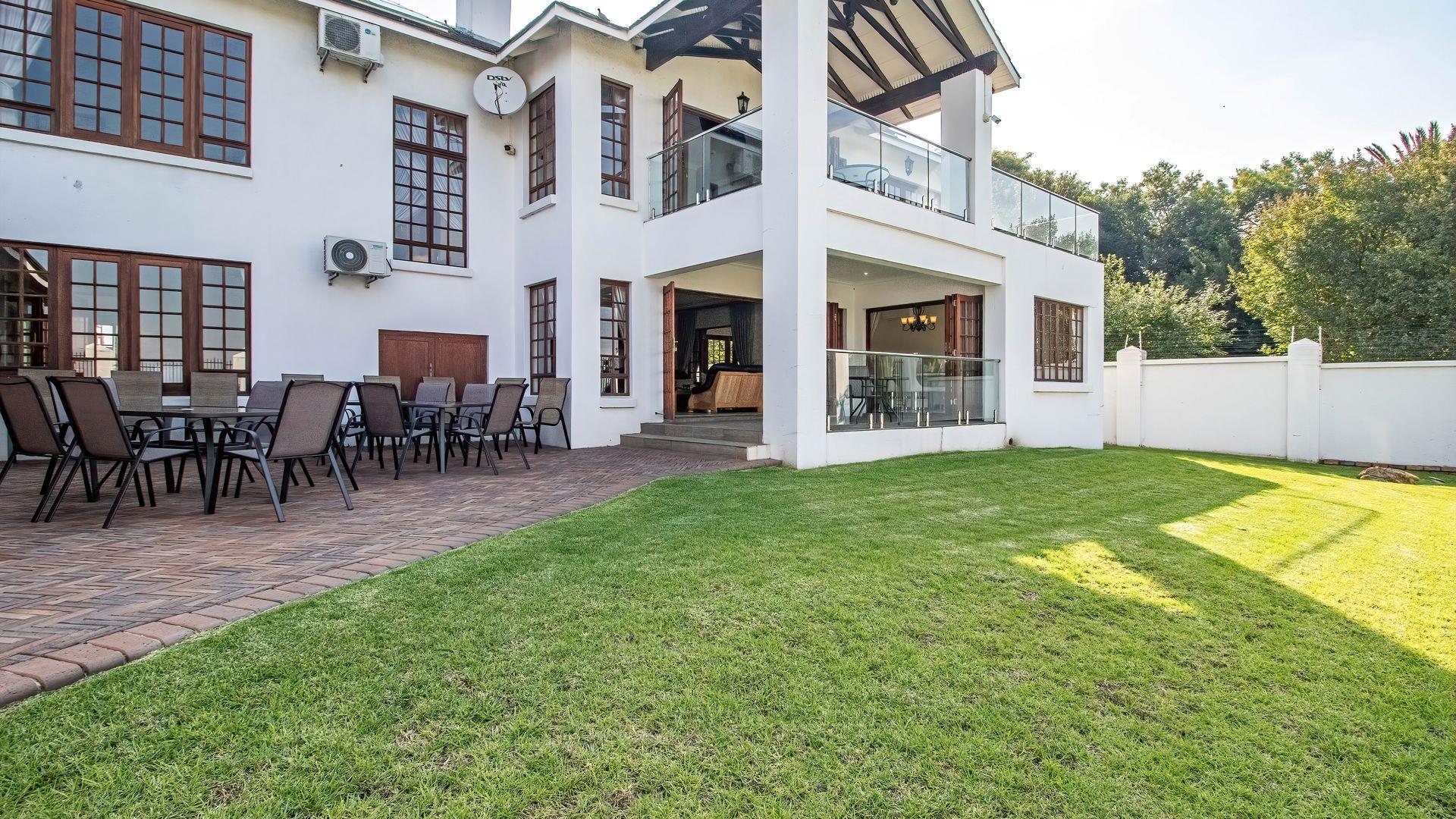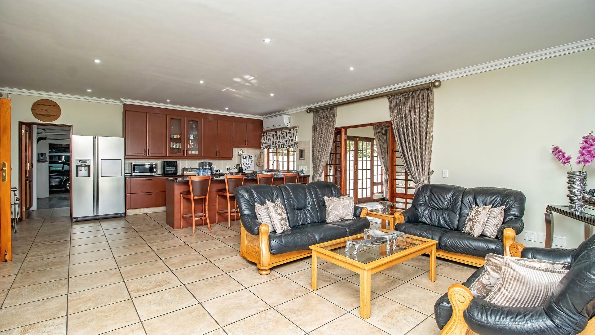 At the heart of the home lies a beautifully appointed open‐plan kitchen, complemented by a separate laundry for convenience. The kitchen flows naturally into the lounge, where a fireplace adds warmth and character. A dedicated dining room provides a formal space for family meals or entertaining, while the lounge opens onto a covered patio overlooking the landscaped garden, a tranquil setting for outdoor living. For those who enjoy entertaining, the property offers a solid‐wood bar and a purpose‐built braai room. This space is fully equipped with oven, hob, extractor fan, prep bowl, and stacker doors that extend the entertainment area seamlessly into the garden.