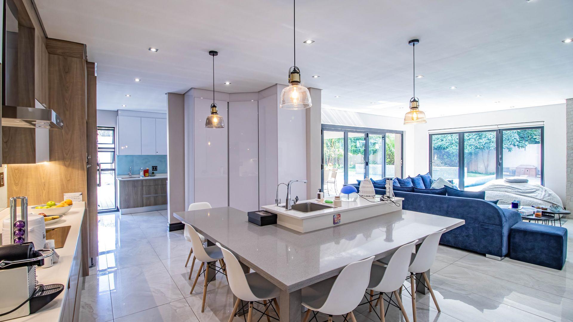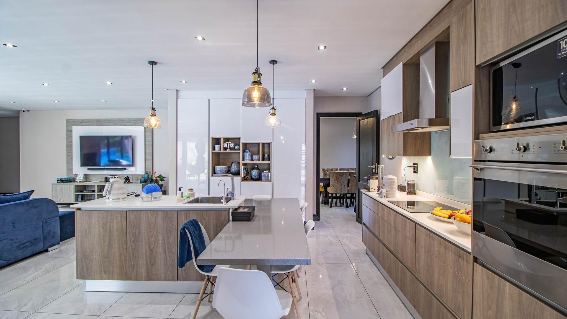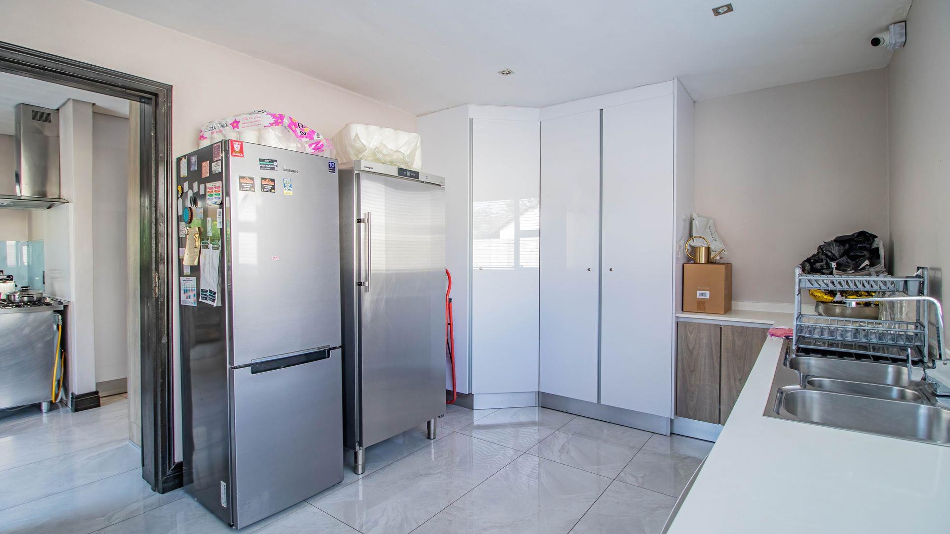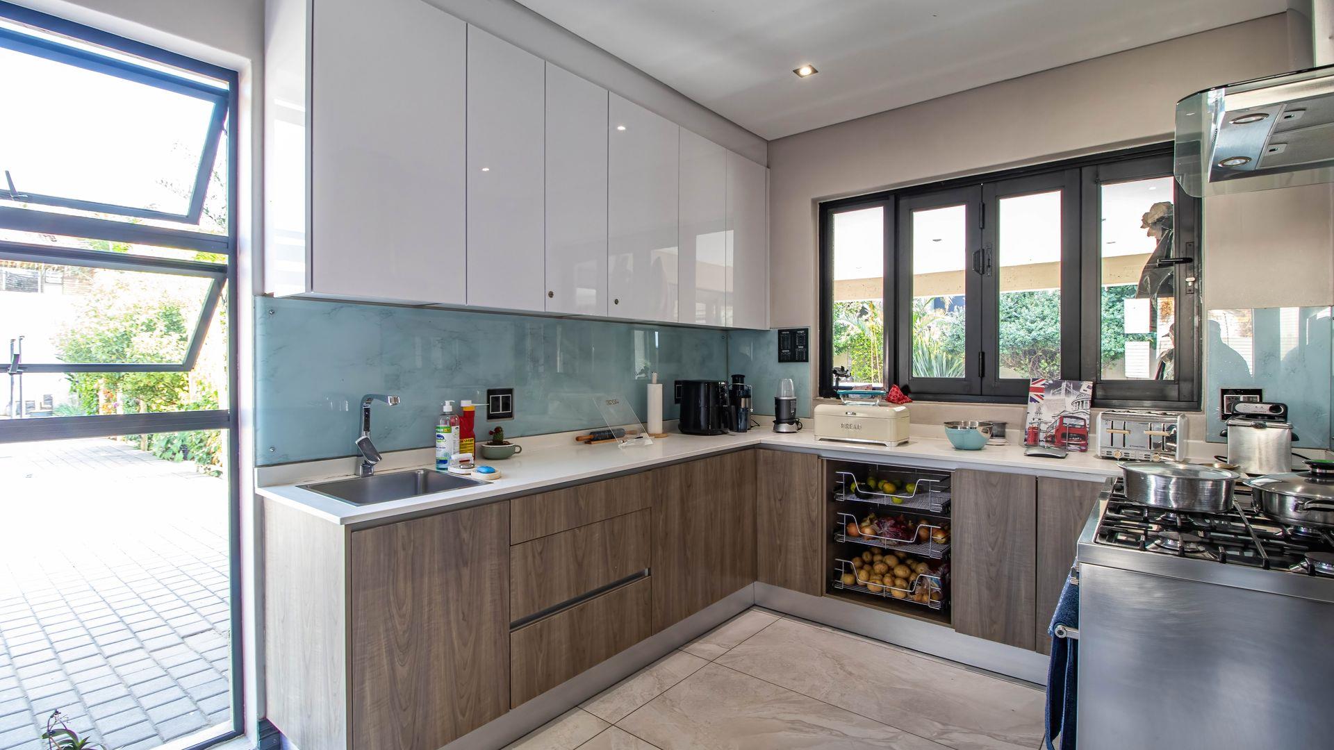 At the heart of the home lies a beautifully appointed modern kitchen, complete with an electric hob, breakfast nook, and ample cabinetry. For those who love to host or have larger families, a fully equipped second kitchen with a gas stove, separate scullery, and additional workspace makes catering a breeze.